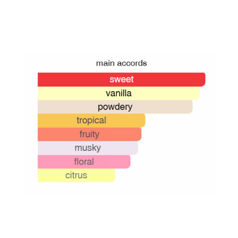 middle notes are Gourmand Accord and Tropical Fruits;
